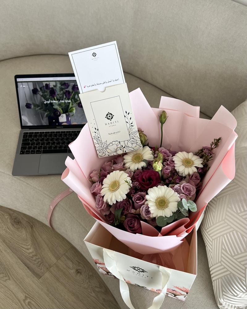 تتضمن باقة مودة مجموعة من الزهور الجميلة مثل الورود الوردية، والأقحوان الأبيض، مع لمسات من الألوان العميقة التي تضيف حيوية. تم ترتيب هذه الزهور بعناية ضمن ورق تغليف أنيق بلون وردي، مما يعكس ذوقاً رفيعاً.