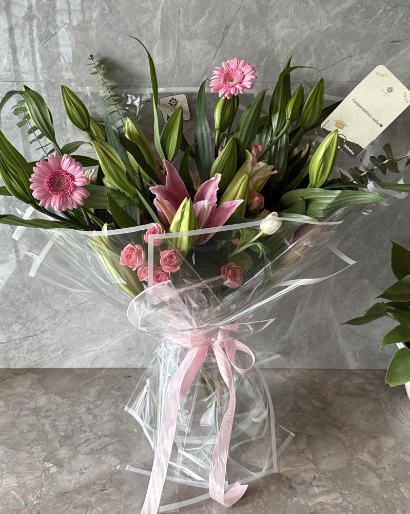 • ألوان مبهجة: يحتوي البوكيه على زهور متعددة الألوان، بما في ذلك الورود الوردية والزنابق، مما يخلق تناغمًا بصريًا يجذب الأنظار.