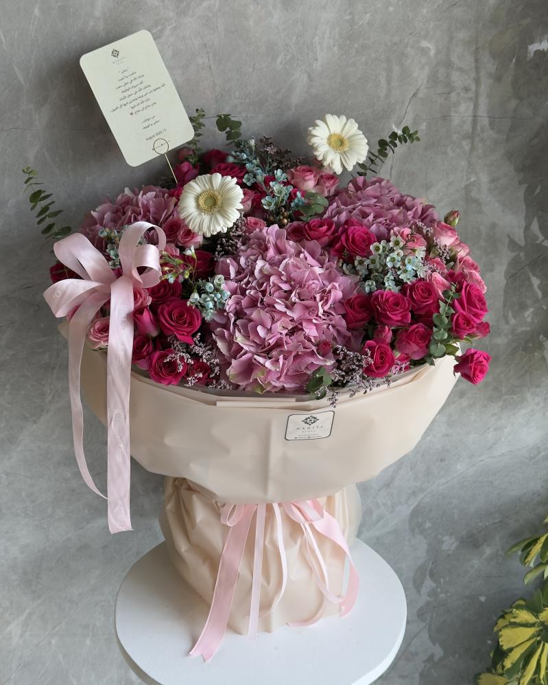 بوكيه Haditi هو الخيار المثالي لتوصيل هدايا جدة في نفس اليوم. يتميز هذا البوكيه بألوان زاهية من الورود، حيث تجمع بين الورود الوردية، الأرجوانية، والأبيض، مما يخلق مزيجًا رائعًا يجذب الأنظار ويضيف لمسة من الفخامة لأي مناسبة.