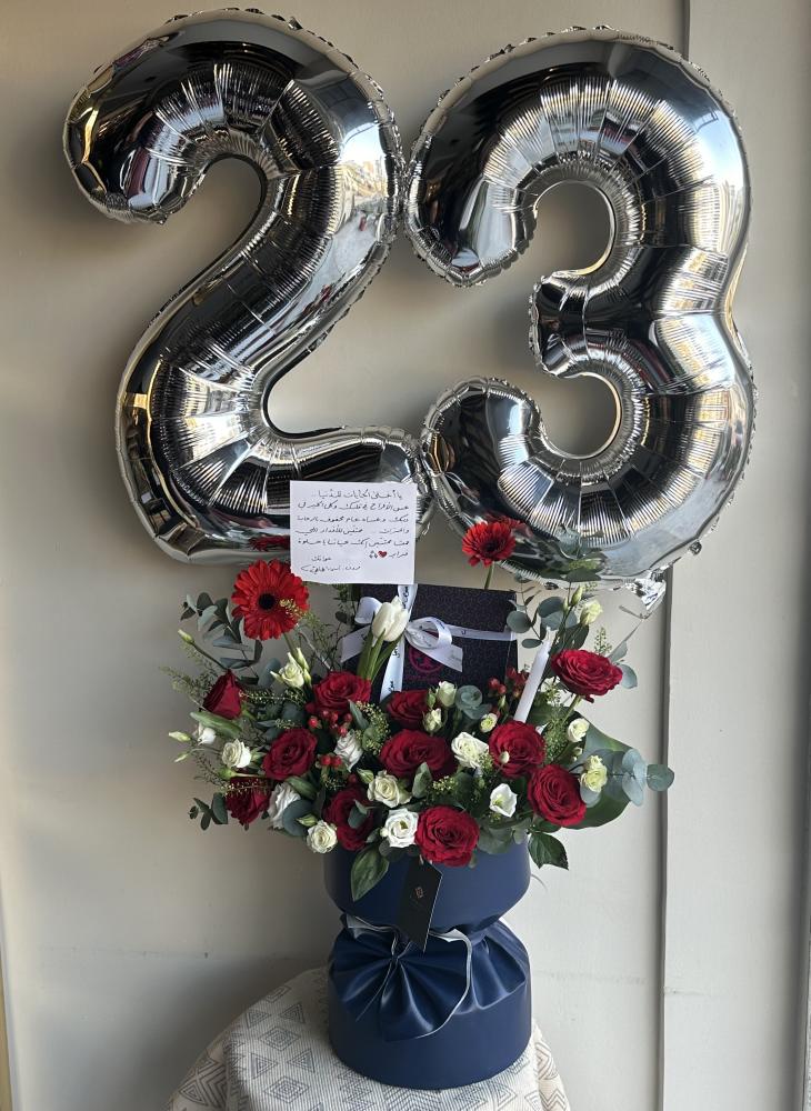 تتضمن هذه الهدية باقة من الزهور الجميلة، مثل الورود الحمراء، التي تتناغم مع الألوان الأخرى بشكل رائع. كما أن التغليف الأنيق باللون الأزرق الداكن يضفي لمسة من الفخامة على الهدية، مما يجعلها مثالية لكل المناسبات، من أعياد الميلاد إلى الاحتفالات الخاصة.