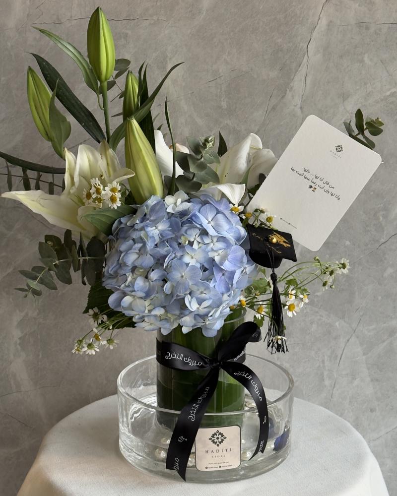 فازة تخرج هدرنجا وليليوم هي الخيار المثالي لتكون ضمن قائمة هدايا تخرج مميزة. تتميز هذه الفازة بتصميم أنيق يجمع بين الألوان الزاهية واللمسات الفنية الرائعة. تحتوي الفازة على زهور زرقاء رائعة، مما يجعلها تعكس الفرح والاحتفال بهذه المناسبة الخاصة.